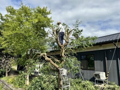 令和7年9月27日(土)昨年に引き続き、魚津市の西布施交流館にて技能奉仕活動をさせていただきました。ハチに警戒しながら樫の木の剪定作業を行いました。